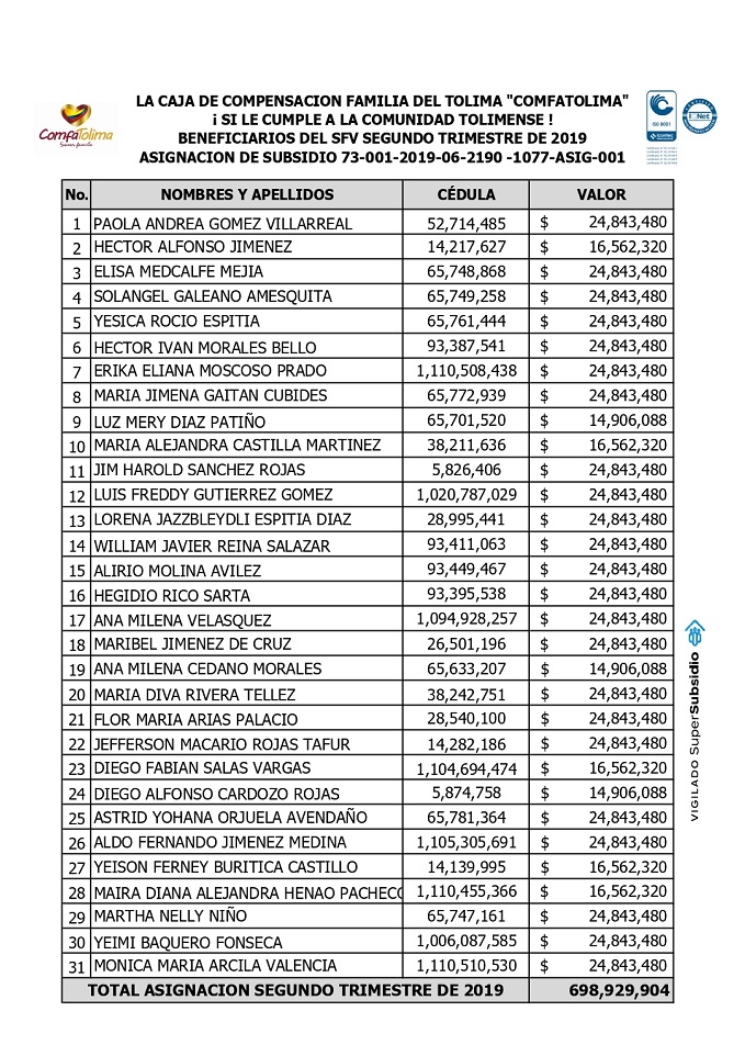 Ibagué, 27 de junio de 2019 ComfaTolima aumenta cuota de subsidio familiar monetario La nueva tarifa quedó en $30.399. Habrá pago retroactivo desde enero de 2019, de acuerdo con lo establecido por la Superintendencia de Subsidio Familiar para el Departamento del Tolima La cuota de subsidio familiar es Leer más…