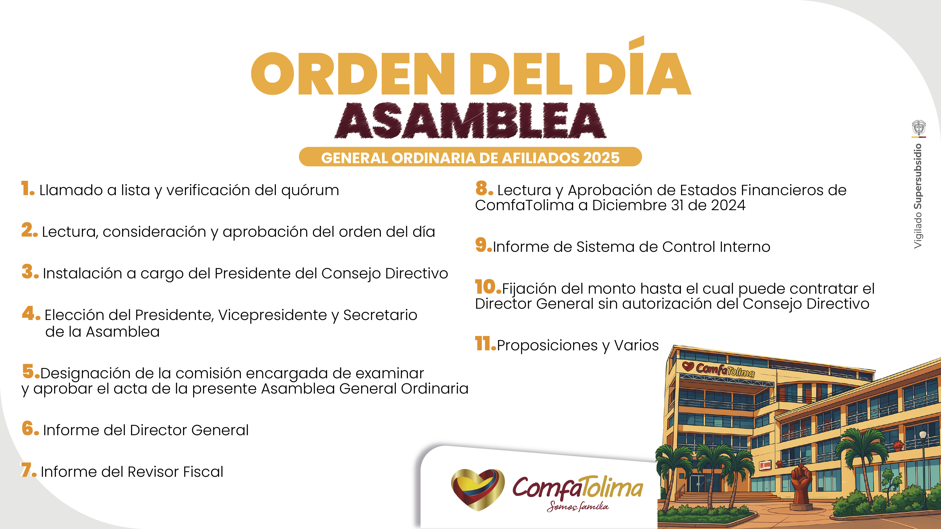 El Director General, de conformidad con el artículo 36 de los Estatutos de la Corporación, CONVOCA a los empleadores afiliados, a la Asamblea General Ordinaria, que se llevará a cabo el día jueves 26 de junio de 2025, a partir de las 2:00 p.m., en el auditorio Jesús María Pinto Edificio ComfaTolima ubicado en la Calle 69 con Avenida Ambalá esquina No. 19-109 piso 3, Ibagué.