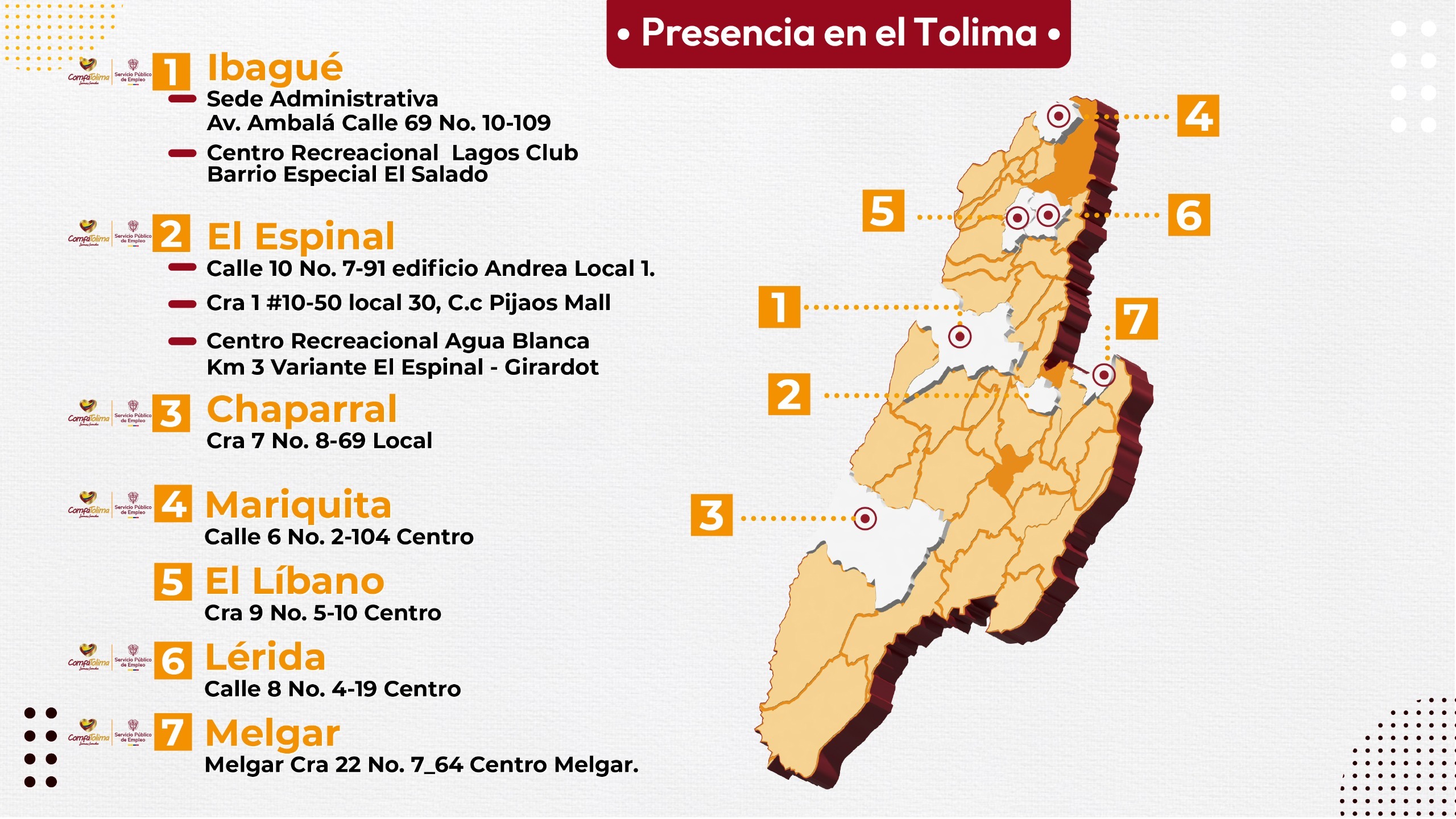 ComfaTolima, la Caja de Compensación del Tolima, tiene dispuestas oficinas regionales ubicadas estratégicamente en el norte, sur, centro y oriente del departamento, para brindar una oportuna prestación del servicio a los afiliados y beneficiaros, con un total de 7 sedes en el Tolima.