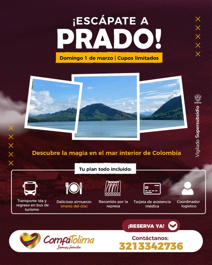 Si buscas un plan en un lugar cálido y cercano a Bogotá, la Represa de Prado Tolima es el destino ideal para ti. Este viaje de escapada podrás disfrutar de una increíble cascada y relajarte de un refrescante baño. Después de esta parada, continuaremos el viaje a la represa donde podremos disfrutar de este hermoso embalse rodeado de montañas de la cordillera oriental donde esperamos tener un maravilloso atardecer.
