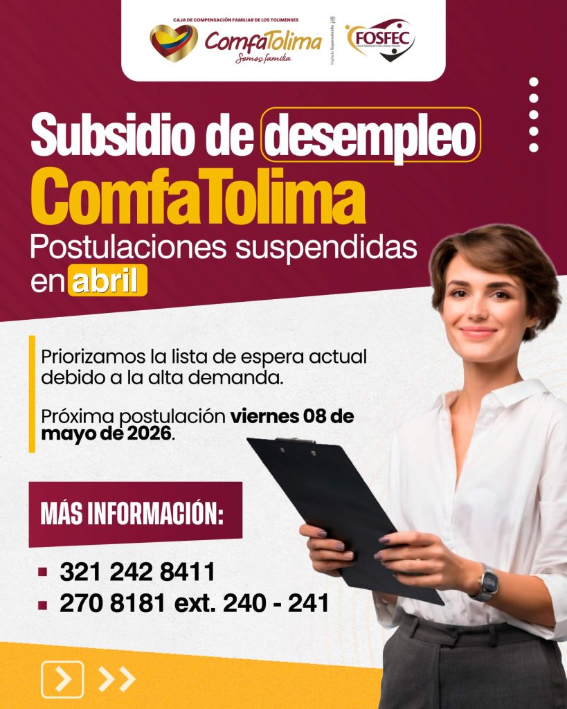 La Caja de Compensación ComfaTolima informa a sus afiliados que, durante el mes de abril de 2026, no se abrirán nuevas postulaciones al subsidio de desempleo.