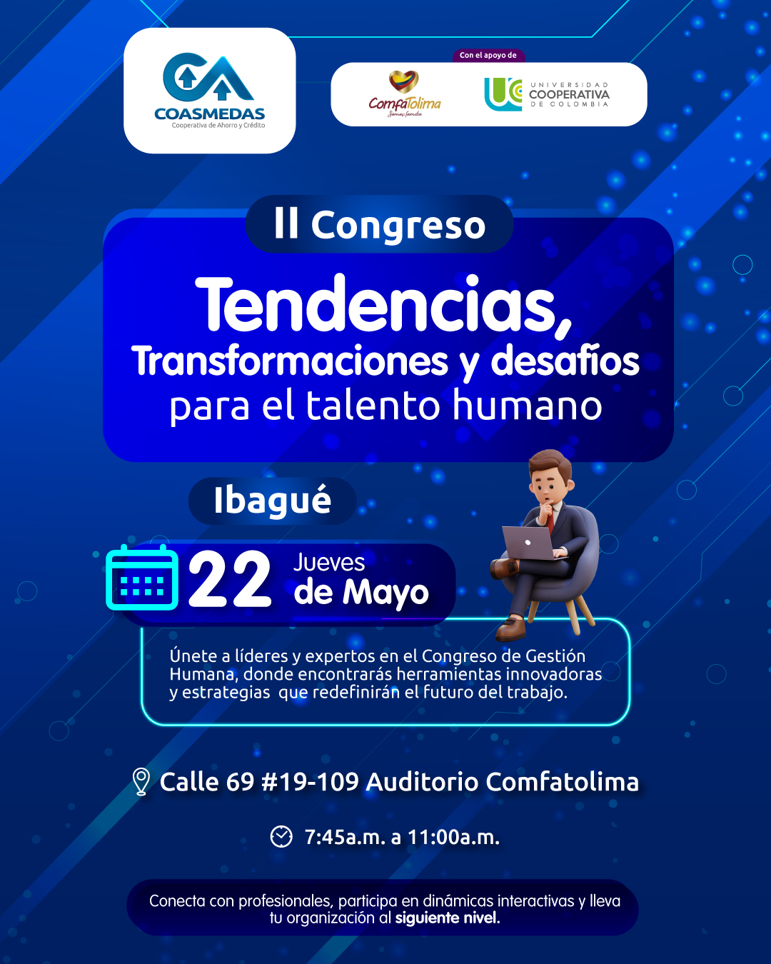 ComfaTolima, Coasmedas y la Universidad Cooperativa de Colombia anuncian la realización del Segundo Congreso: Tendencias, Transformaciones y Desafíos para el Talento Humano, un espacio de análisis, formación y actualización sobre los retos actuales en la gestión de personas y el impacto creciente de la inteligencia artificial en las organizaciones.